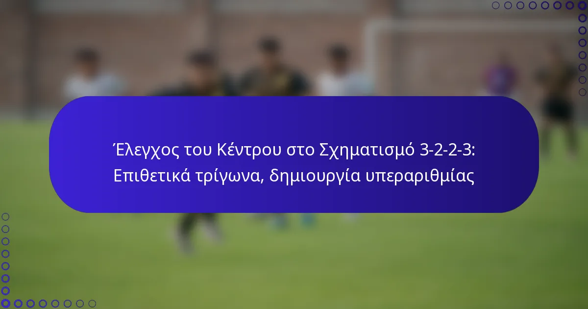 Ο έλεγχος του κέντρου στο σχηματισμό 3-2-2-3 αναφέρεται στη στρατηγική κυριαρχία της μεσαίας γραμμής, επιτρέποντας σε μια ομάδα να επιβάλλει τον ρυθμό και τη ροή του παιχνιδιού. Αυτός ο έλεγχος είναι κρίσιμος για τη δημιουργία επιθετικών ευκαιριών και τη διατήρηση της κατοχής, επηρεάζοντας τελικά την έκβαση των αγώνων.
